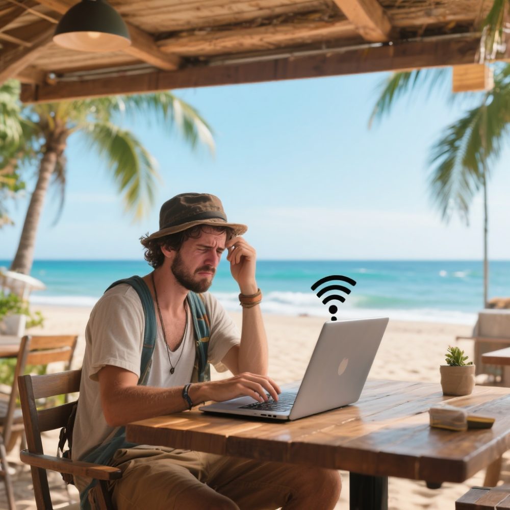 Эта романтическая ерунда про работу с пляжа разбивается о реальность в первый же день. Попробуйте поработать при 35-градусной жаре и влажности 80%. Ноутбук перегревается, экран бликует так, что ничего не видно, песок забивается в клавиатуру. А про интернет в каком-нибудь варунге на Бали лучше вообще молчать — 5 мбит/с в хороший день, если повезет.
